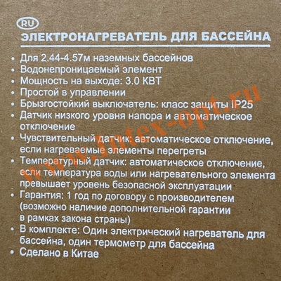 Подключается к фильтрующему насосу(производительностью от 2006 до 9462 л/ч). Оборудован автоматом УЗО (защита от поражения током), сенсором уровня воды и термостатом.