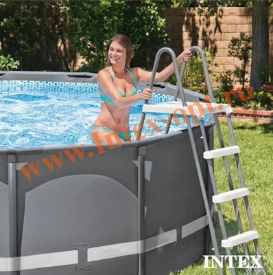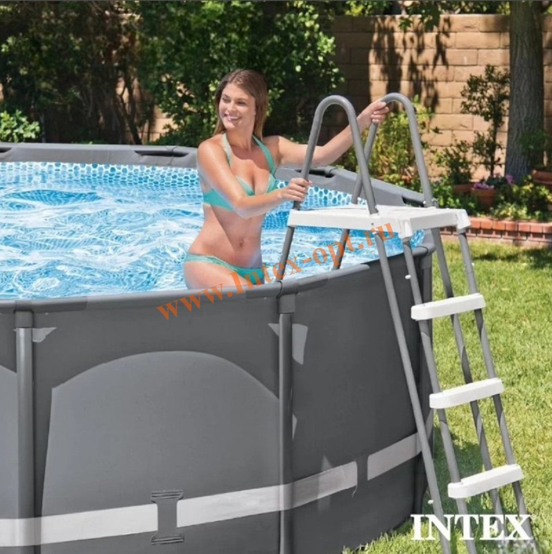 Лестница с площадкой Intex 28076 (28073) Deluxe Pool Ladders With Removable Steps" изготовлена из стальных стоек и прочных пластиковых ступеней.