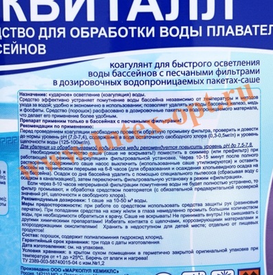 Через 10-15 минут после полного растворения содержимого саше насос выключить (использованные саше утилизируются), и оставить бассейн на техническом перерыве на 6-8 часов (для образования и осаждения хлопьевидного осадка на дно).