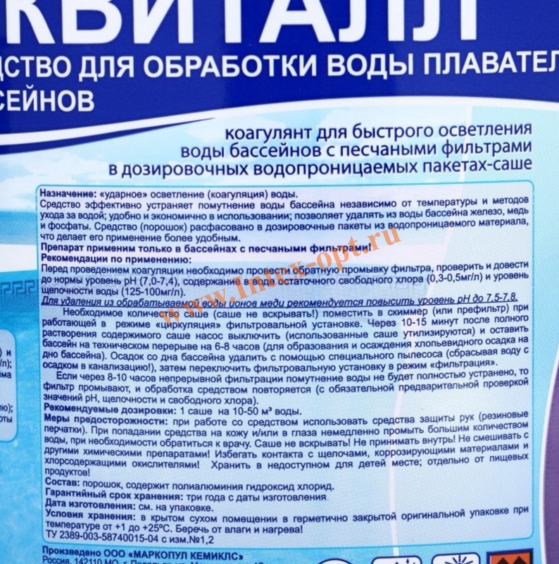 Препарат эффективно устраняет помутнение воды бассейна независимо от температуры и методов ухода за водой; экономичен в использовании; позволяет удалять из воды бассейна железо, медь и фосфаты.