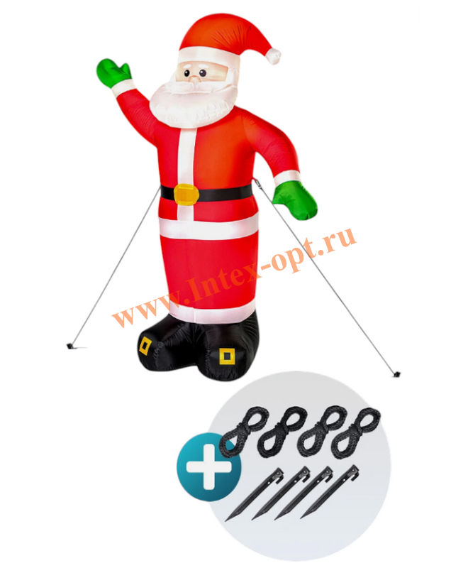 Комплектация: надувная фигура с подсветкой -1 шт., утяжелитель (расположен внутри фигуры), веревки и колышки для крепления, упаковка - картонная коробка.