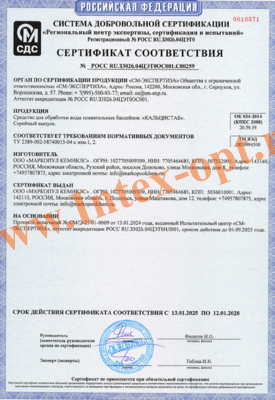 При добавлении свежей воды в бассейн добавляйте 20-30 мл на 1 куб.м свежей воды.