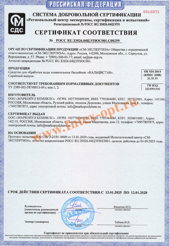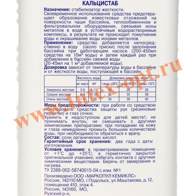 Кальцистаб связывает ионы металла в хелатные комплексы, что позволяет не вызывать реакцию помутнения и окрашивания воды.
