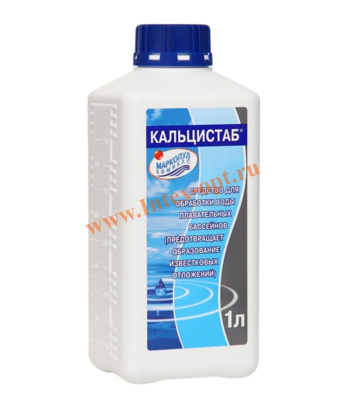 Кальцистаб 1л, жидкое средство предназначеное для предотвращения известковых отложений на облицовке бассейнов, а также на фильтрующем оборудовании.