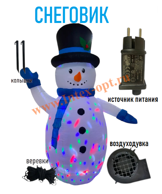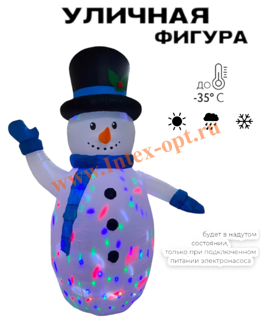 Комплектация: новогодняя уличная надувная фигура, встроенный компрессор, LED подсветка, проектор, низковольтный адаптер.
