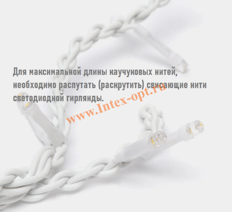Для максимальной длины каучуковых нитей, необходимо распутать (раскрутить) свисающие нити светодиодной гирлянды.