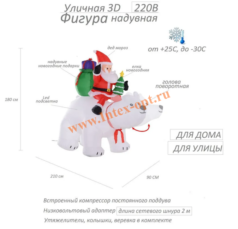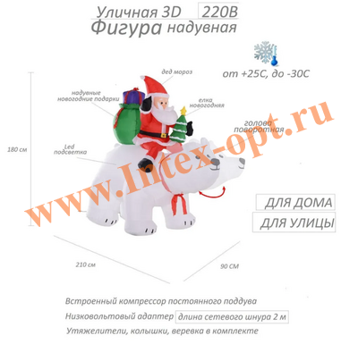 Комплектация: новогодняя уличная надувная фигура, встроенный компрессор, LED подсветка, проектор, низковольтный адаптер.