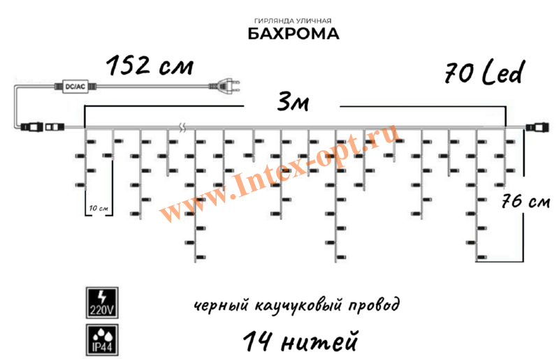 - Расстояние между - лампочками: 10 см