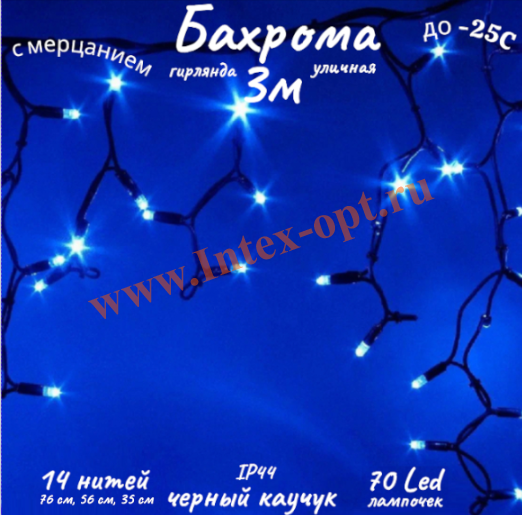Гирлянда бахрома уличная 3м, синяя с мерцанием, черный каучук IP44