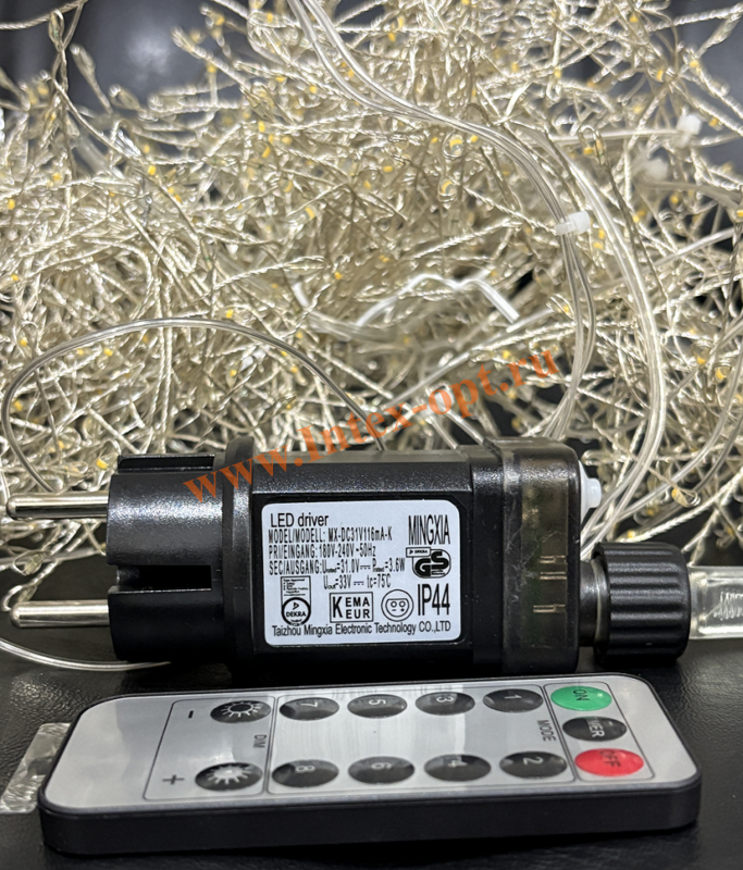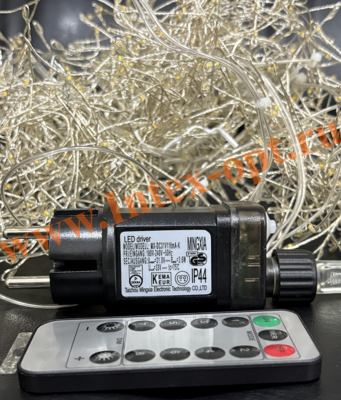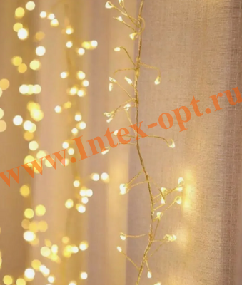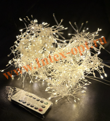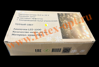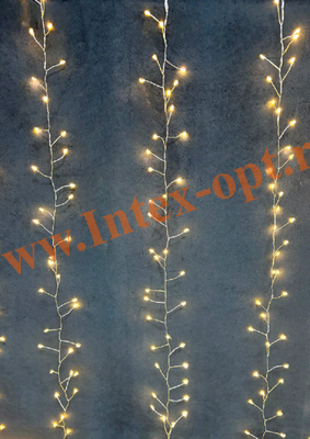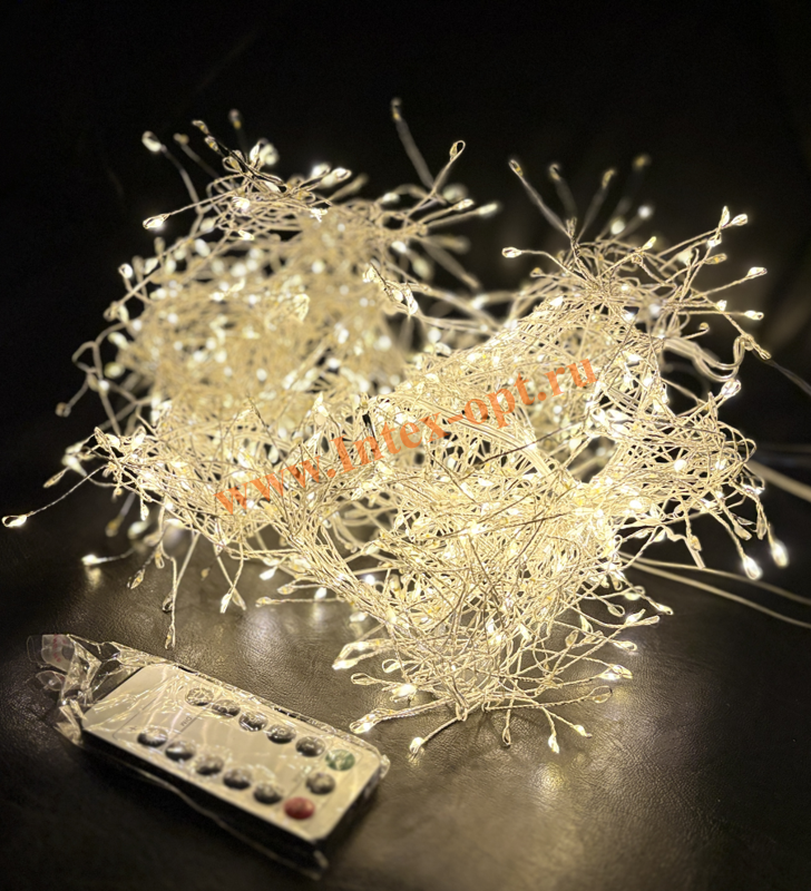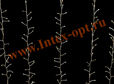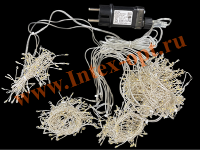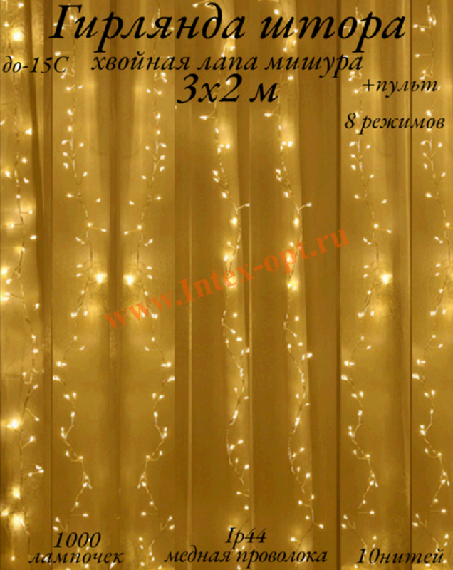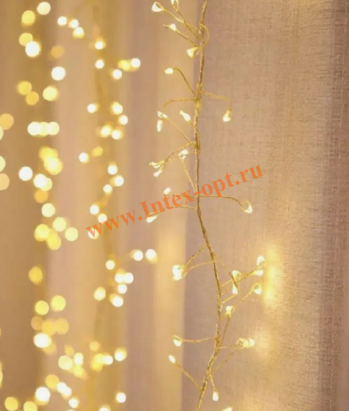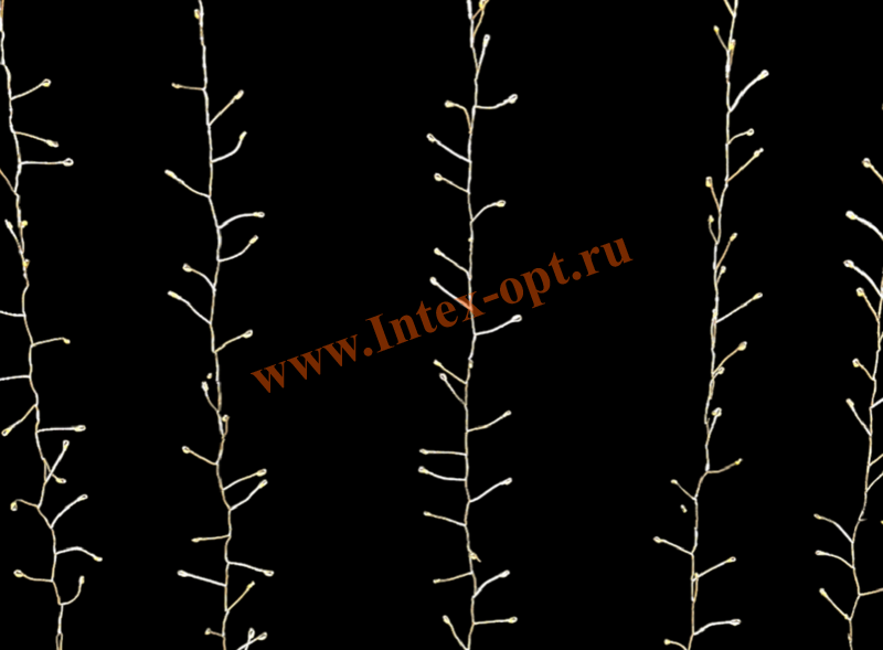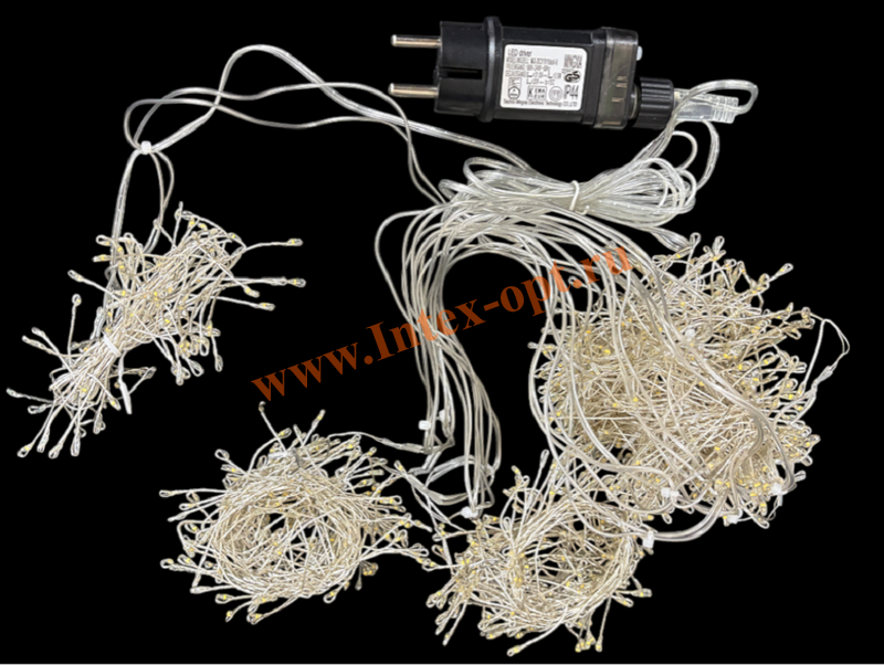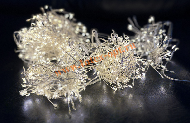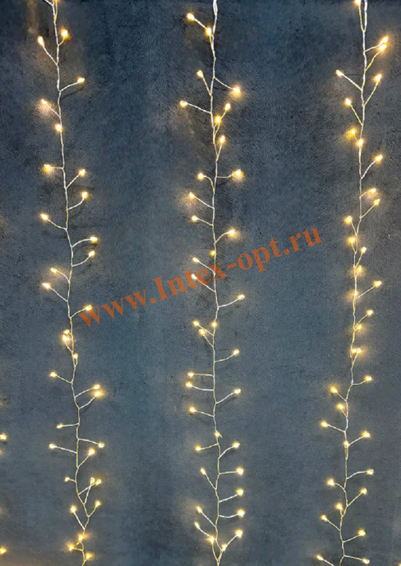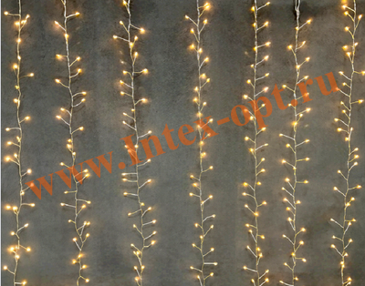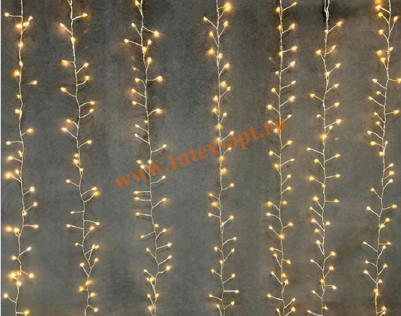 Гирлянда штора выполнена в виде основного шнура, с которого свисают нити с расположенными на них 1000 светодиодами.