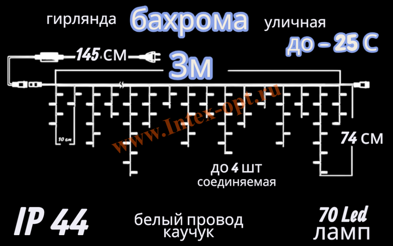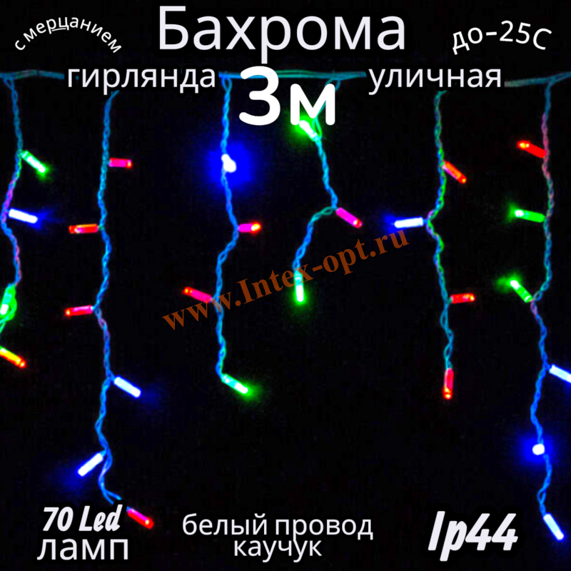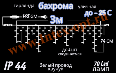 Бахрома уличная 3м, Led лампочки 70 шт., новогодняя гирлянда украсит помещение как внутри, так и снаружи.