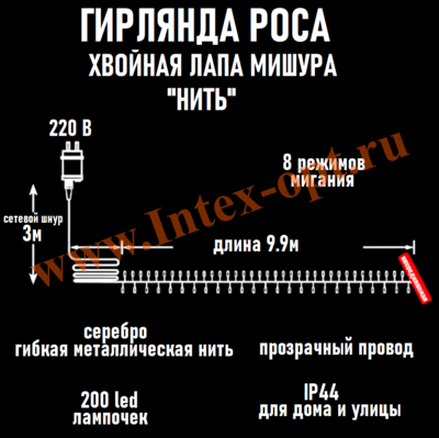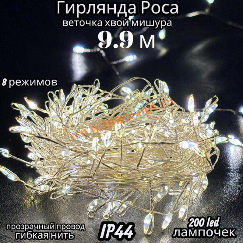 Уличная гирлянда Роса мишура хвойная лапа 9.9 метров - это светодиодная нить, которая подойдет для украшения окна, дома, офиса, квартиры, витрины магазина.