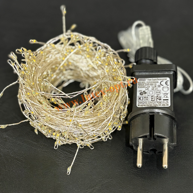 Уникальность данной гирлянды в том, что ее легкие нити практически не заметны на предмете, создается ощущение, что огоньки зависли в воздухе.