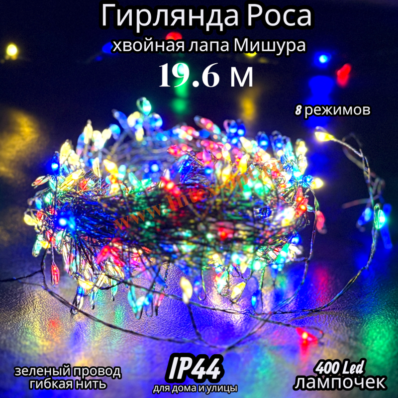 - Вид электрогирлянды: Роса - хвойная лапа, мишура