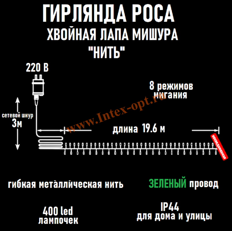 Гибкая нить легко крепится на любую поверхность и имеет высокую степень пыле - влагозащиты IP44, что делает ее влагостойкой и позволяет использовать ее на открытой территории в зимних суровых условиях.