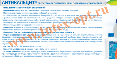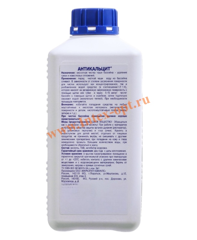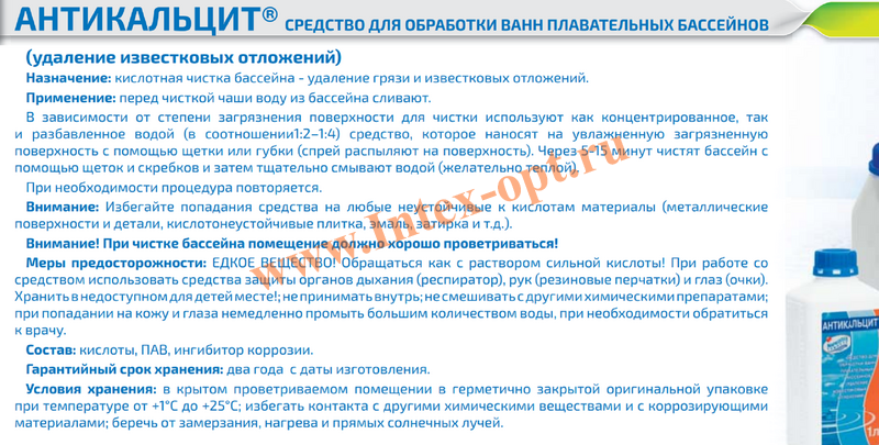 Перед очищением необходимо слить жидкость с бассейна. Препарат в основном разбавляют в пропорциях на 1 л. антикальцита на 4 л. воды, можно пользоваться неразбавленным препаратом.