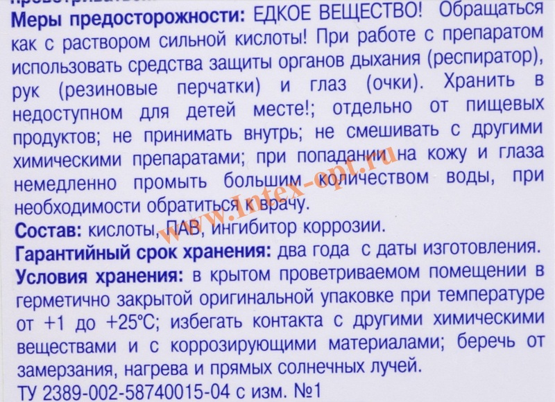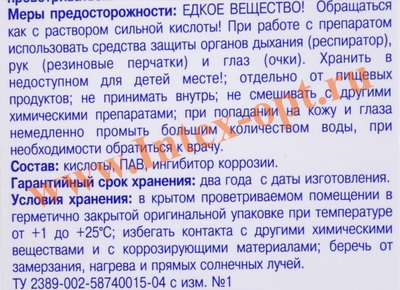 Обязательно следите за тем чтоб, средство не попало на материалы, которые не устойчивые к кислотам (алюминий, кислотно-неустойчивая плитка и т.д.).