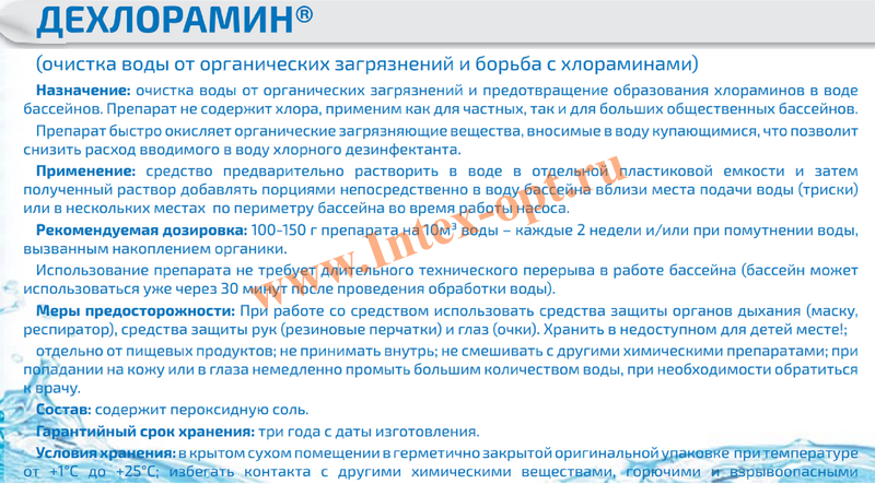 Его применение позволяет снизить расходы на техническом обслуживании (нет необходимости в последующем дехлорировании воды) и существенно уменьшить время технического перерыва, бассейн может использоваться уже через 30 минут после обработки дехлорамином !).