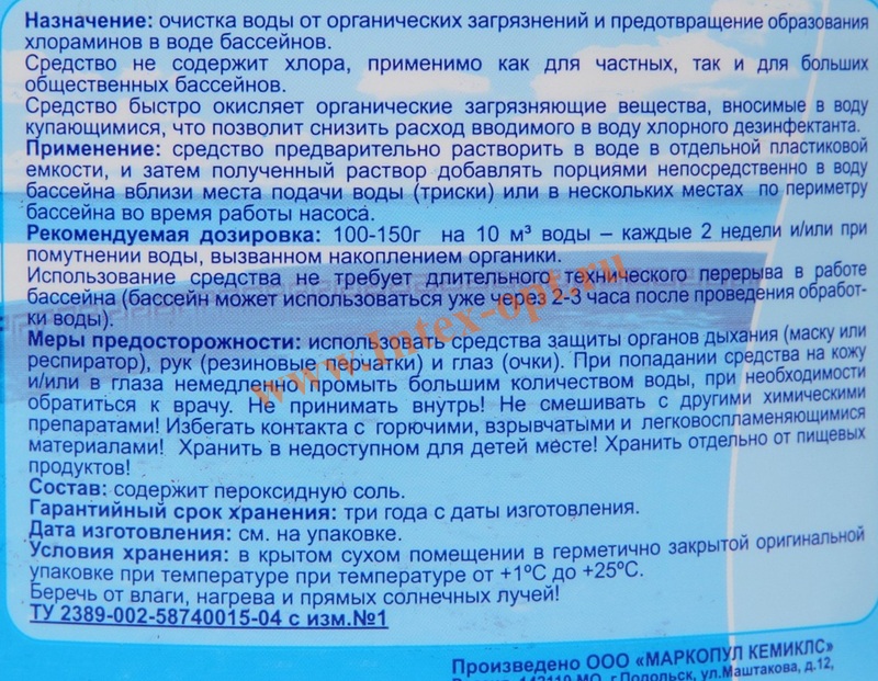 Препарат предварительно растворяют в воде в отдельной емкости и затем полученный раствор добавляют порциями непосредственно в воду бассейна вблизи места подачи воды ,триски или в нескольких местах одновременно во время работы циркуляционного насоса.