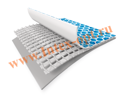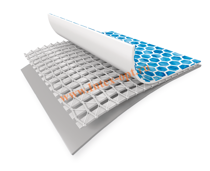 Технология SUPER‑TOUGH: три слоя (два ПВХ + полиэстер) обеспечивают устойчивость к ударам, растяжениям, УФ‑излучению и хлору. Полипропиленовая лента по периметру поддерживает форму.
